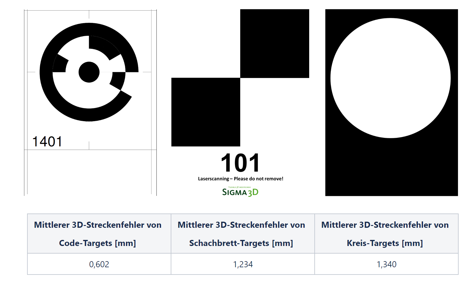Fazit: Im Bereich bis 7 m weisen die Code-Targets bessere Ergebnisse auf als die bisher verwendeten Standard-Targets, d.h. für enge Bereiche wie z.B. Treppenhäusern stellen sie eine sinnvolle Ergänzung zu den 2D und 3D Targets dar.