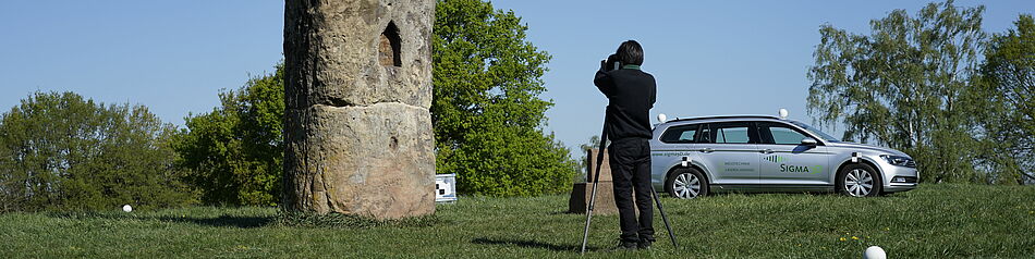 Das Messteam von sigma3D stand vor der Herausforderung den Stein ohne große Kosten und Aufwand vollumfänglich zu scannen, was gerade wegen der Höhe schwierig wird.