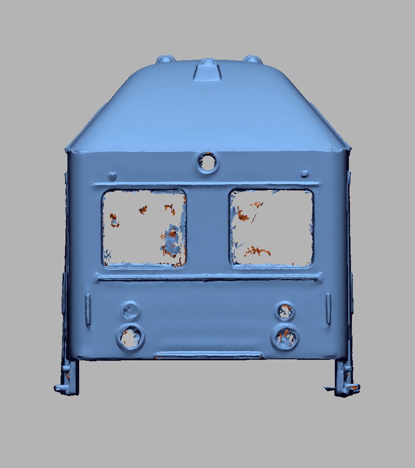 Da es zur Entwicklung der Wagenfront keine Vorlage gibt, kam nur eine indirekte Vorgehensweise bei der Datengewinnung infrage. Wie im ersten Teil wurden auch hier die Bauteile, dieses Mal die Wagen, mit dem GOM ATOS 5 Scanner gescannt. Anschließend wurden die vorderen und hinteren Wagenfronten des vorhandenen Baujahres rückkonstruiert, wobei selbst feinste Details wie außen entlanglaufende Stromkabel modelliert wurden.